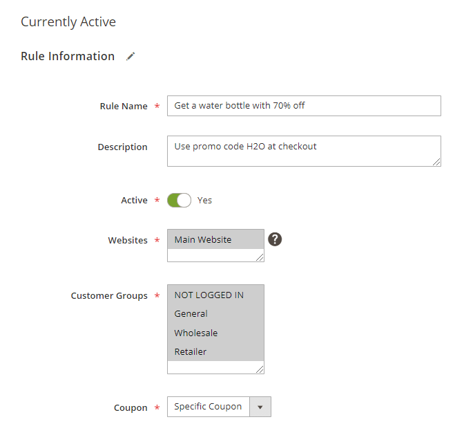Please select Websites and Customer Groups for which this rule will be applied. Enable and disable the rule (Active → 'Yes' / 'No').