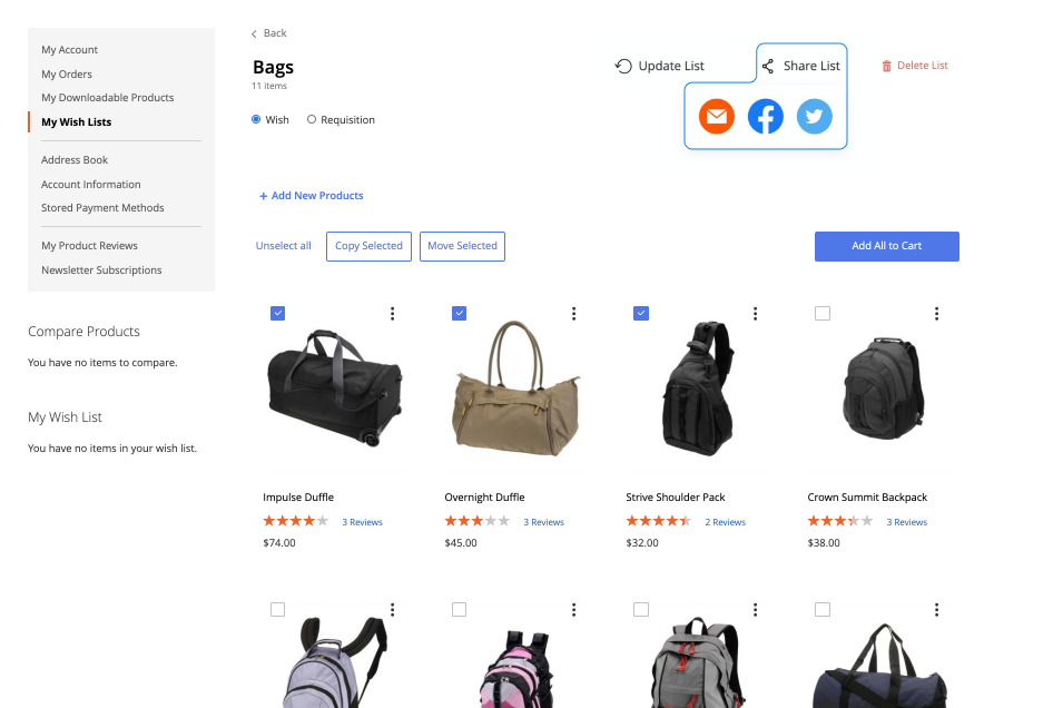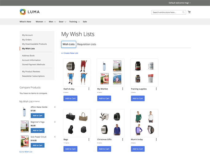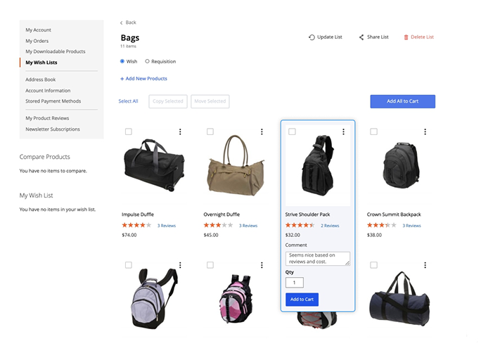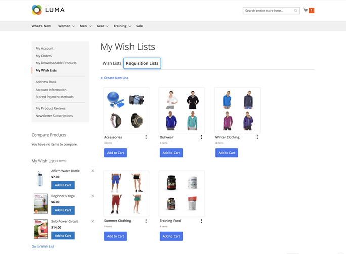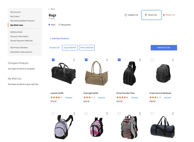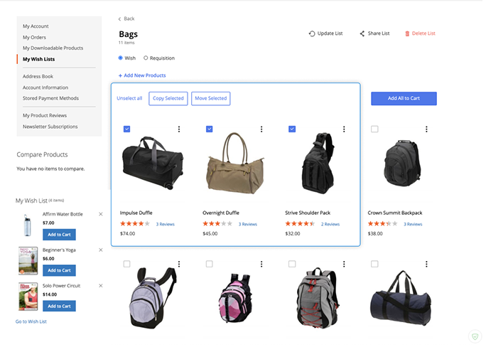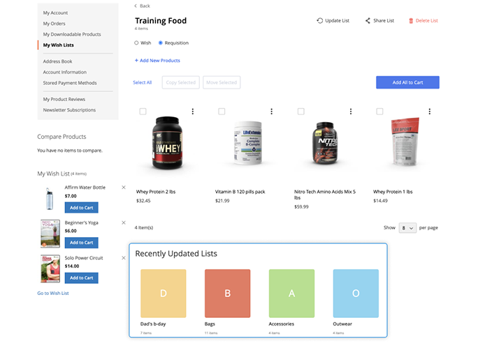 Kindly note, that there is a difference between wishlists and requisition lists functionality. Though, visually wishlists and requisition lists look the same — and have the same management options like rename, move, copy, delete, etc.