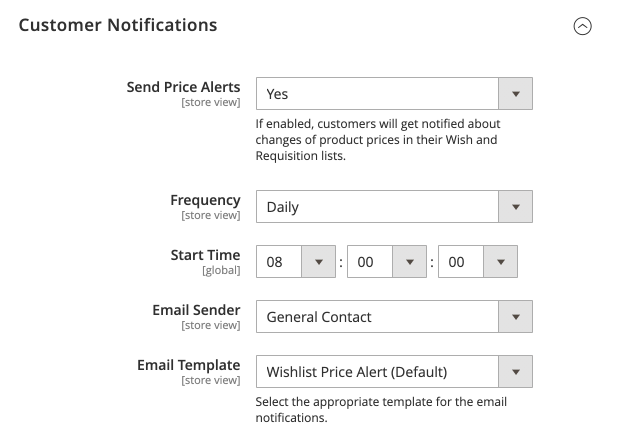 In the Customer Notifications section, you can configure notifications to customers about any changes in the prices of products from their wishlists.