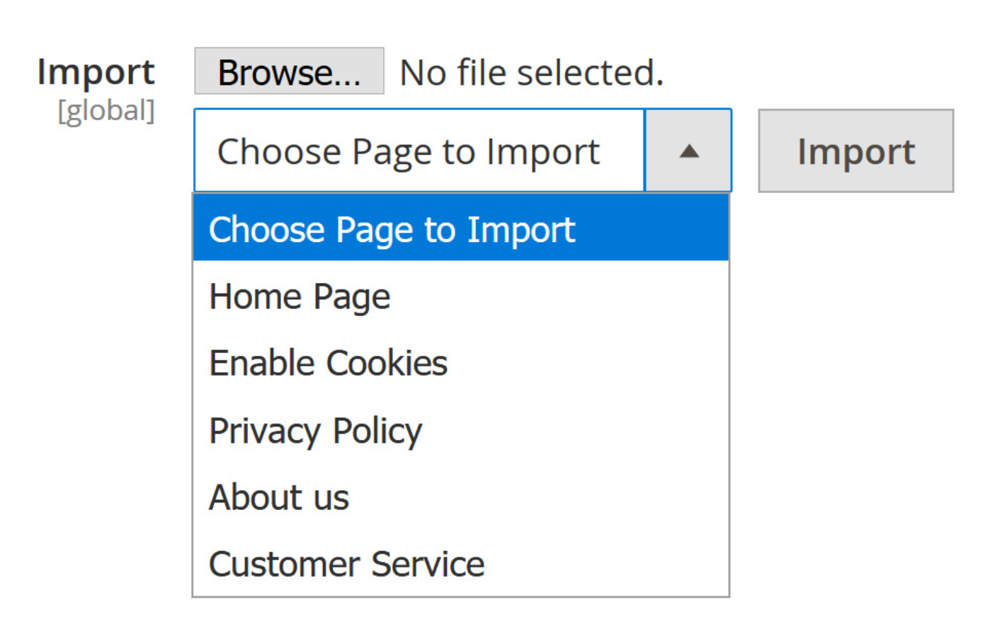 Import: This function allows importing any layout XML to CMS Page.