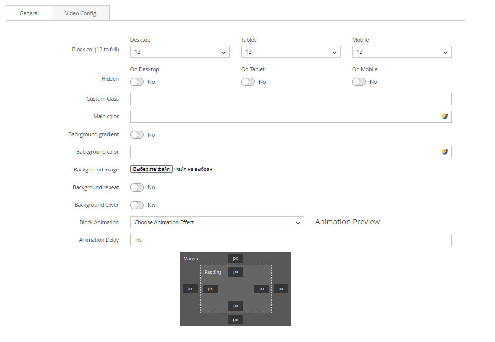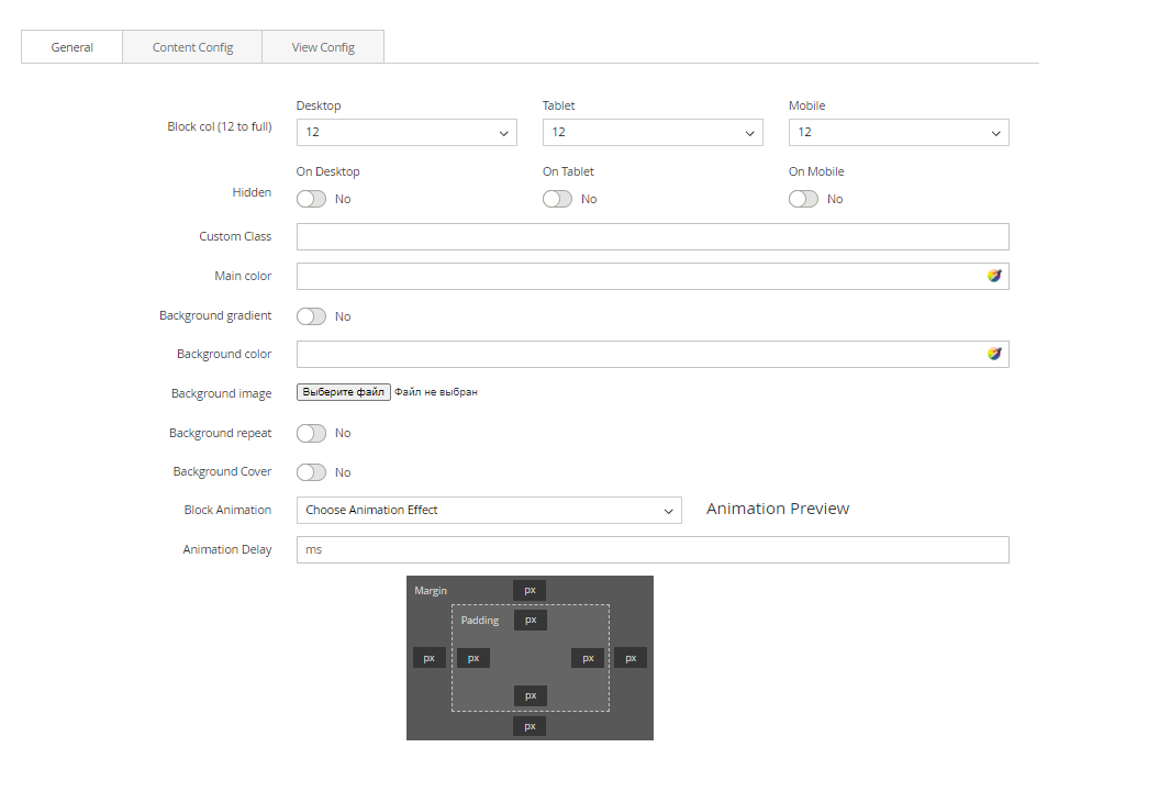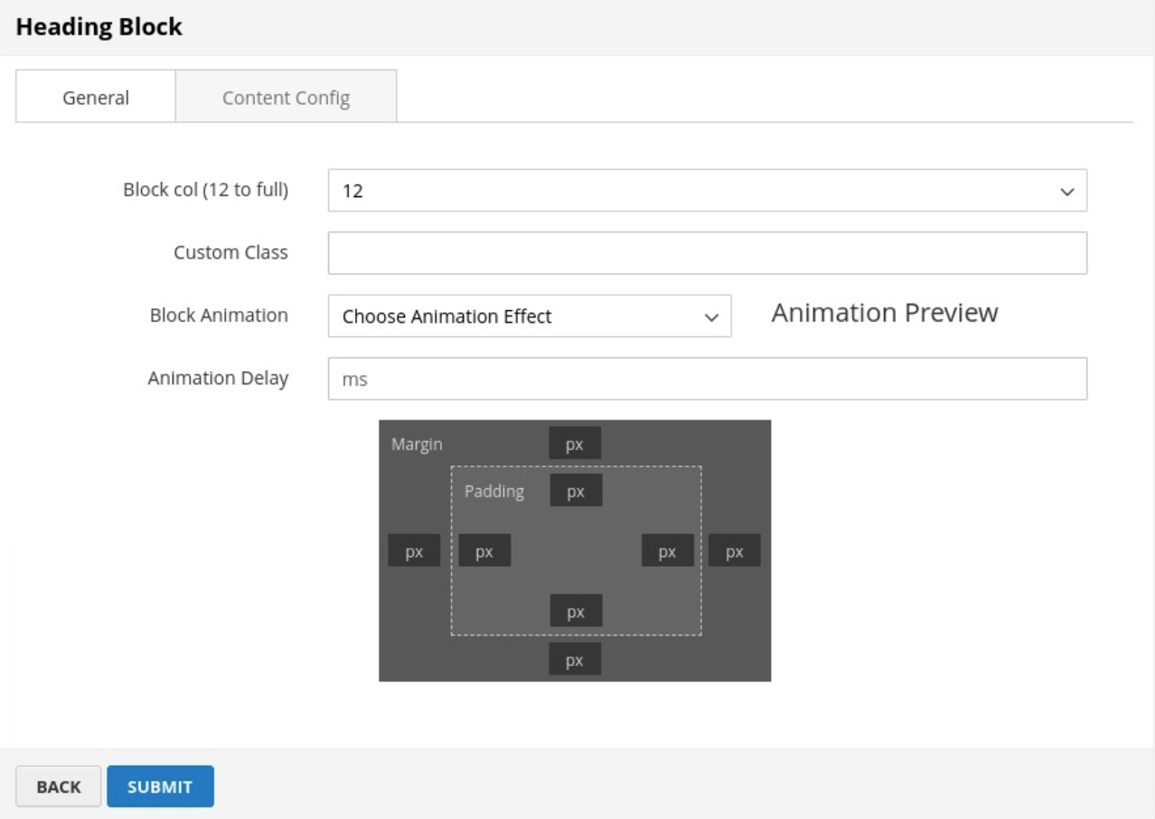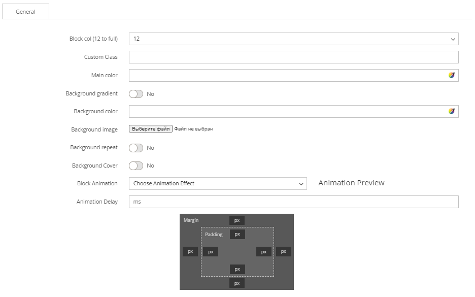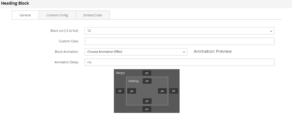 Each block will have different settings, but there are some similar settings on General tab.