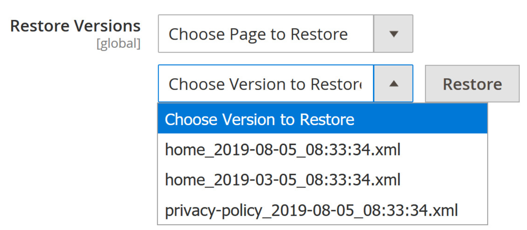 Restore: This function allows backing up any versions of XML of any page to any another page.