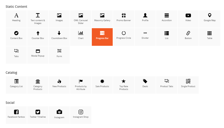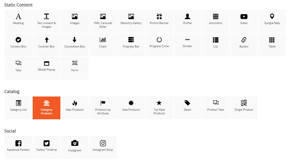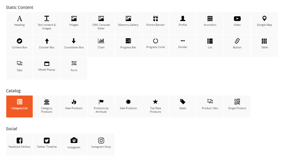 The Category Products element helps to show products by category with different view options (grid, list, slider, category tabs).