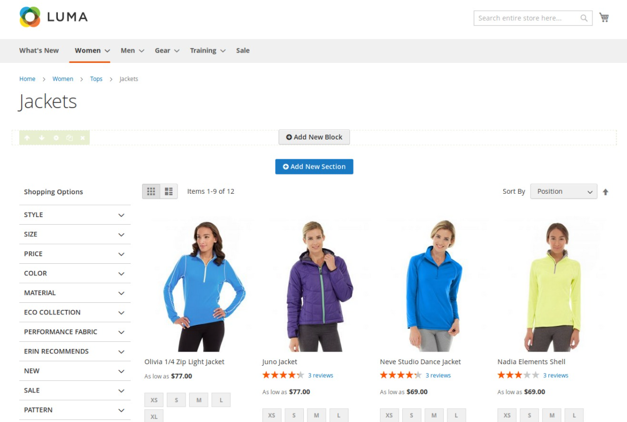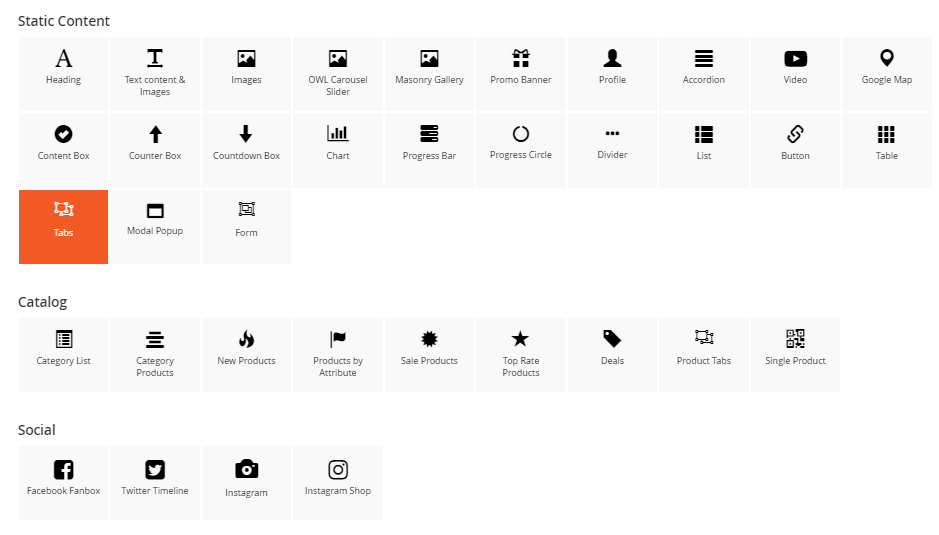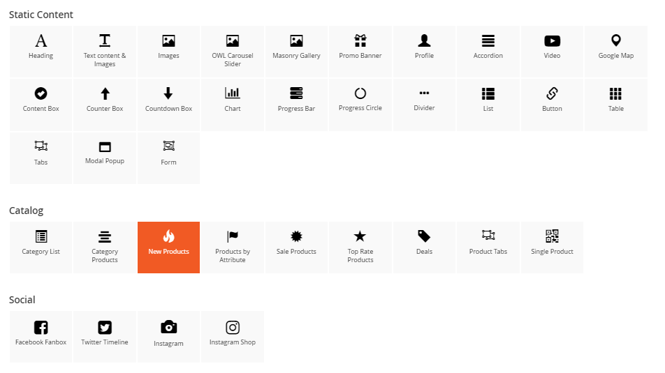 The New Products element helps to show new products, new product by categories with different view options (grid, list, slider, category tabs).