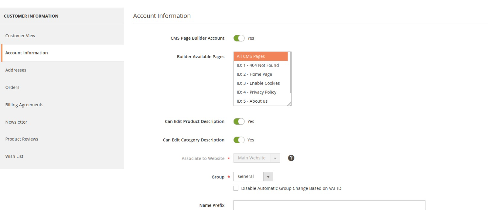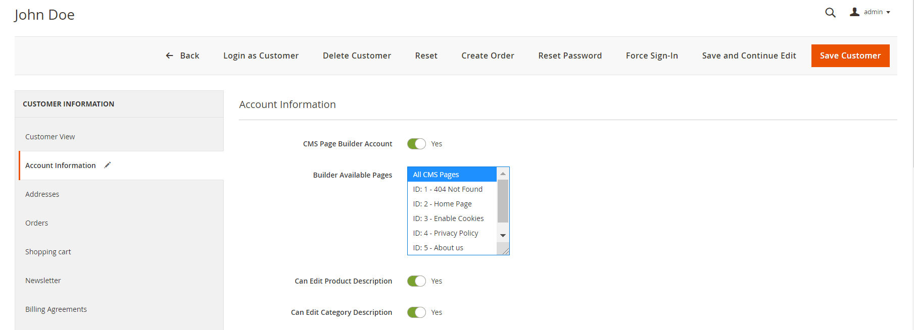 On Edit Customer Page, choose tab Account Information. Find field Can Edit Product Description