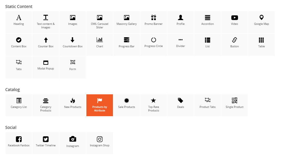 The Products By Attribute element helps to show products by attribute (Yes/No) with different view options (grid, list, slider, category tabs).