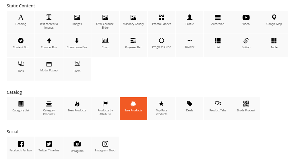 The Sale Products element helps to show sale products, new product by categories with different view options (grid, list, slider, category tabs).