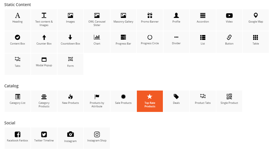 The Top Rate Products element helps to show top rate products with different view options (grid, list, slider, category tabs).