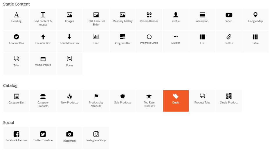 The Deal Products element helps to show deal products with different view options (grid, list, slider, category tabs)