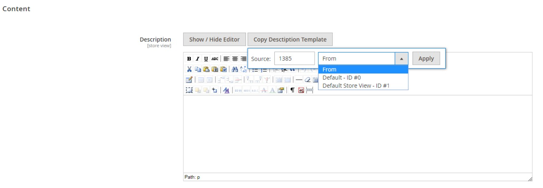If the Product Id you entered exists, a select list will be shown, allow you to choose from which store view to be duplicated.