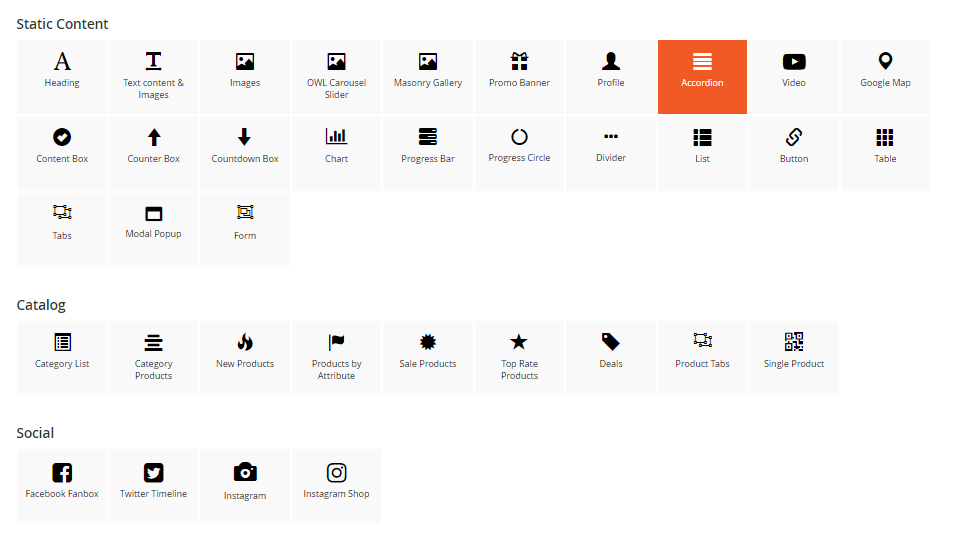 The Accordion element is perfect for adding multiple sections of varied content to your website, and actively selecting which to show or hide at any time.