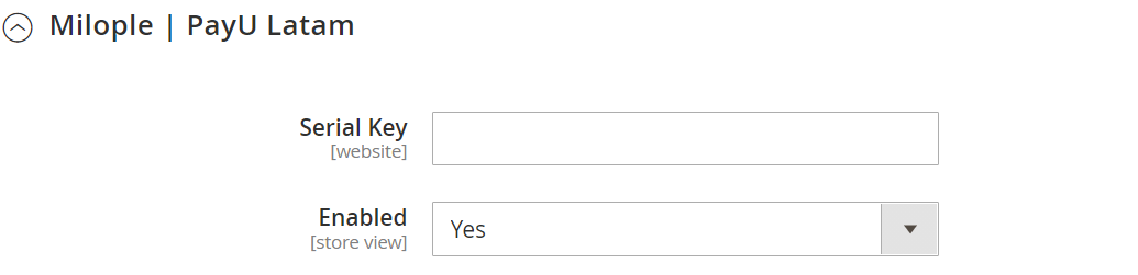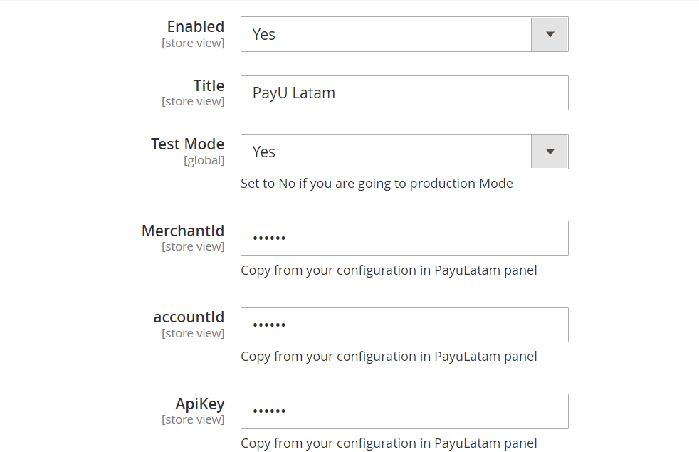 The store admin needs to enter MerchantID, accountID, ApiKey and ApiLogin that will be available on the respective PayU Latam account.