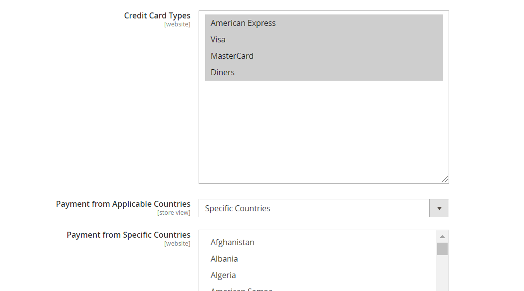 The admin can specify the required credit cards through which payments are to be processed.