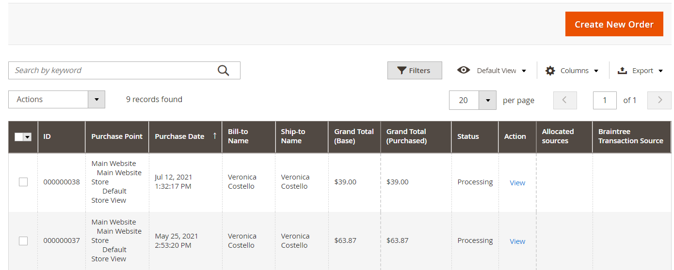 Navigate to Magento2 backend admin panel → Sales → Orders in order to view and manage the details of all orders placed. The admin can also create new orders manually by clicking on “Create new order”.