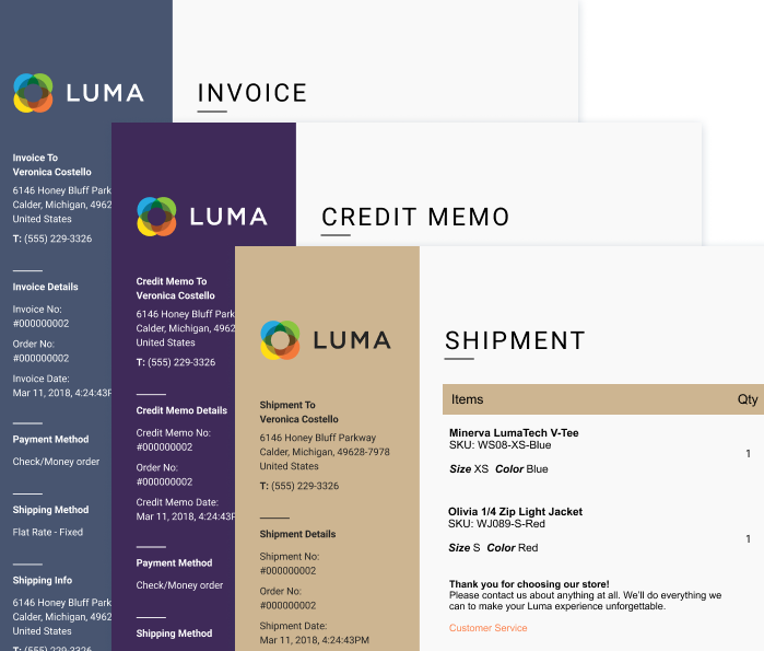 Magento 2 PDF Invoice extension provides you with a set of pre-configured templates for invoices, orders, shipments and credit memos.