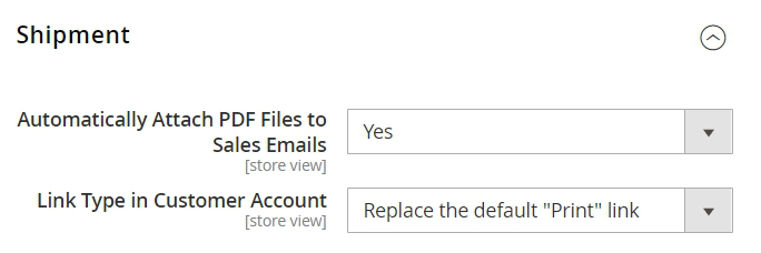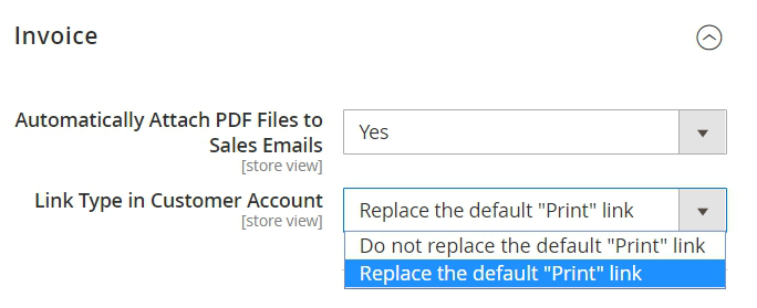 Link Type in Customer Account - choose ‘Replace the default “Print” link’ if you want your customers to download a customized version of PDF file. Select ‘Do not replace the default “Print” link’ if you want to display the default version of PDF document.