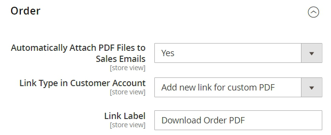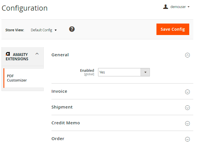 To configure the extension, go to Stores → Configuration → Amasty Extensions → PDF Customizer.