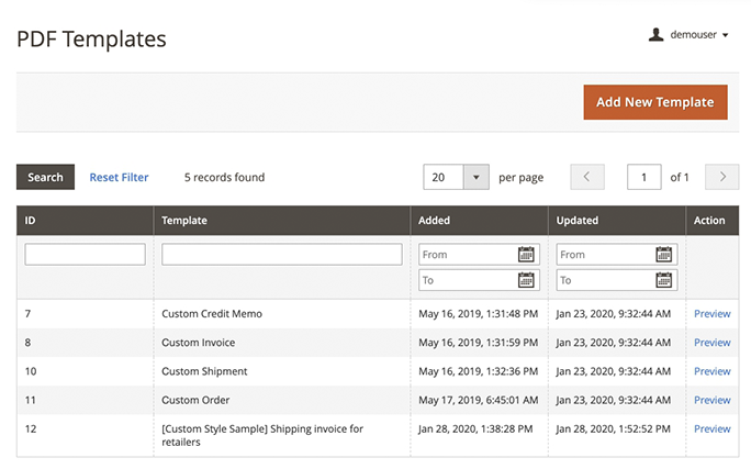 To manage all PDF templates in a handy grid, go to Marketing → Amasty PDF Templates.