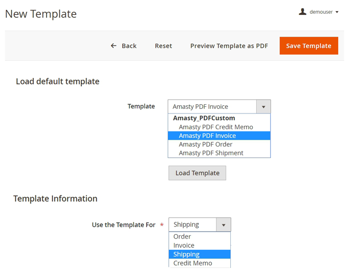 Use the template for - check for which type of PDFs the template will be used. It is possible to load an Invoice PDF template to customize and use as a Shipping PDF. You can create any combination you want to meet business' demands.