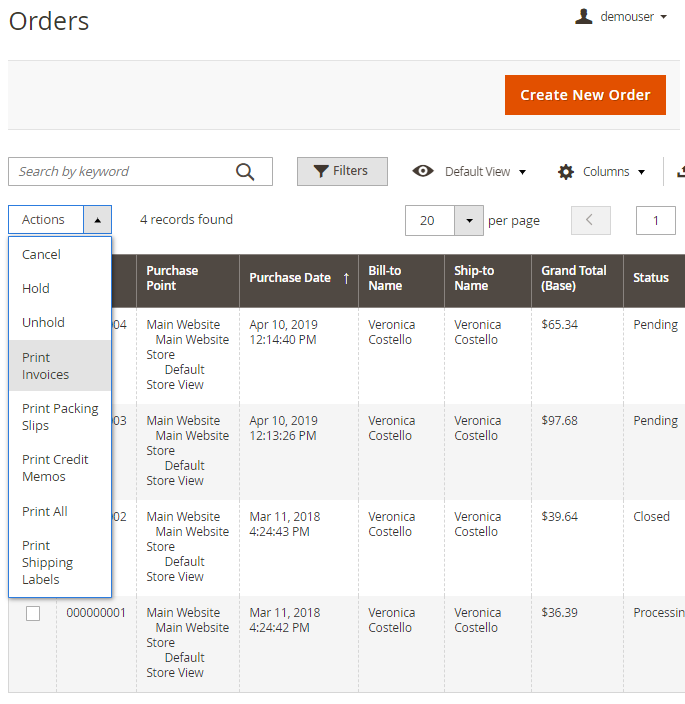 To print all PDF documents in bulk, go to Sales → Orders and choose the necessary option from the Actions dropdown menu.