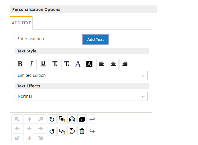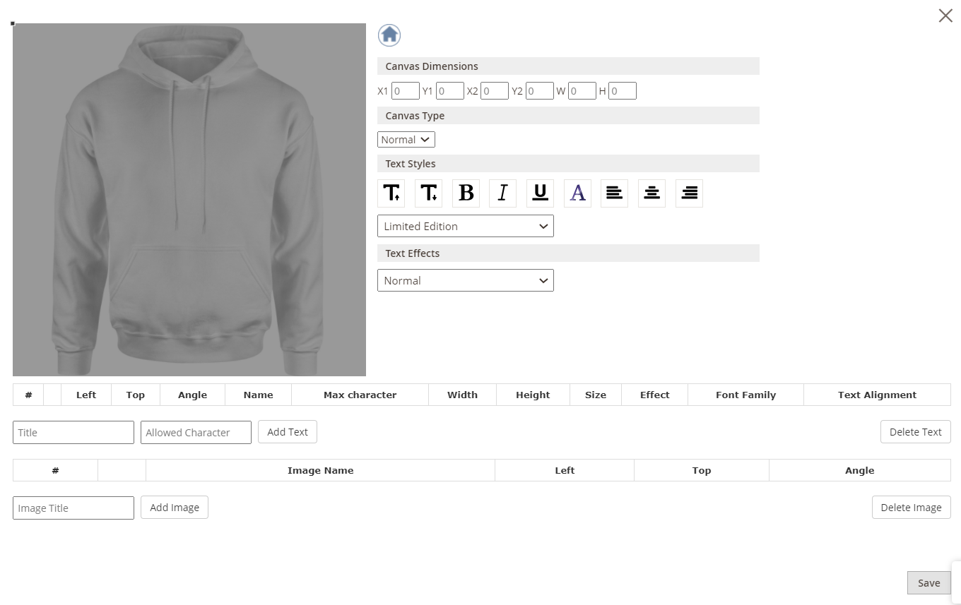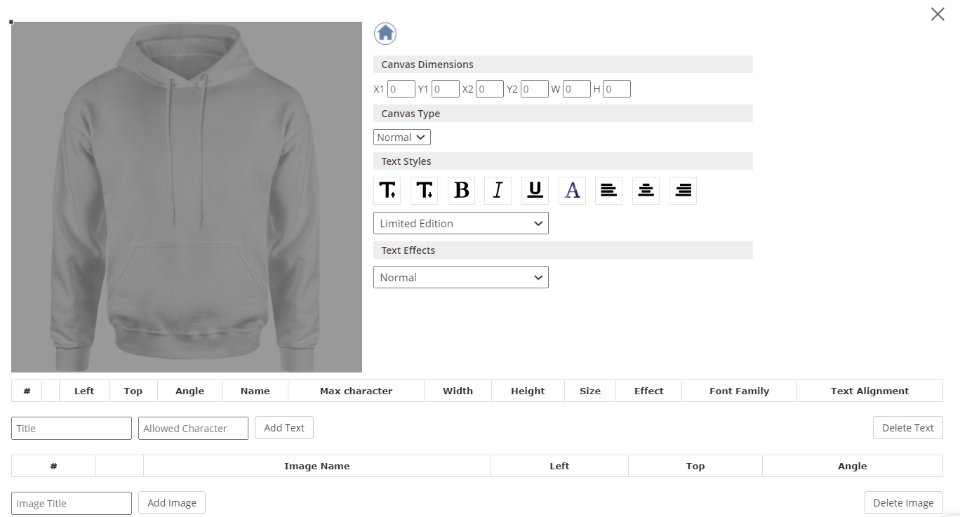 In this section, the customer can add a text in the design area. Text style, text effect can also be edited.