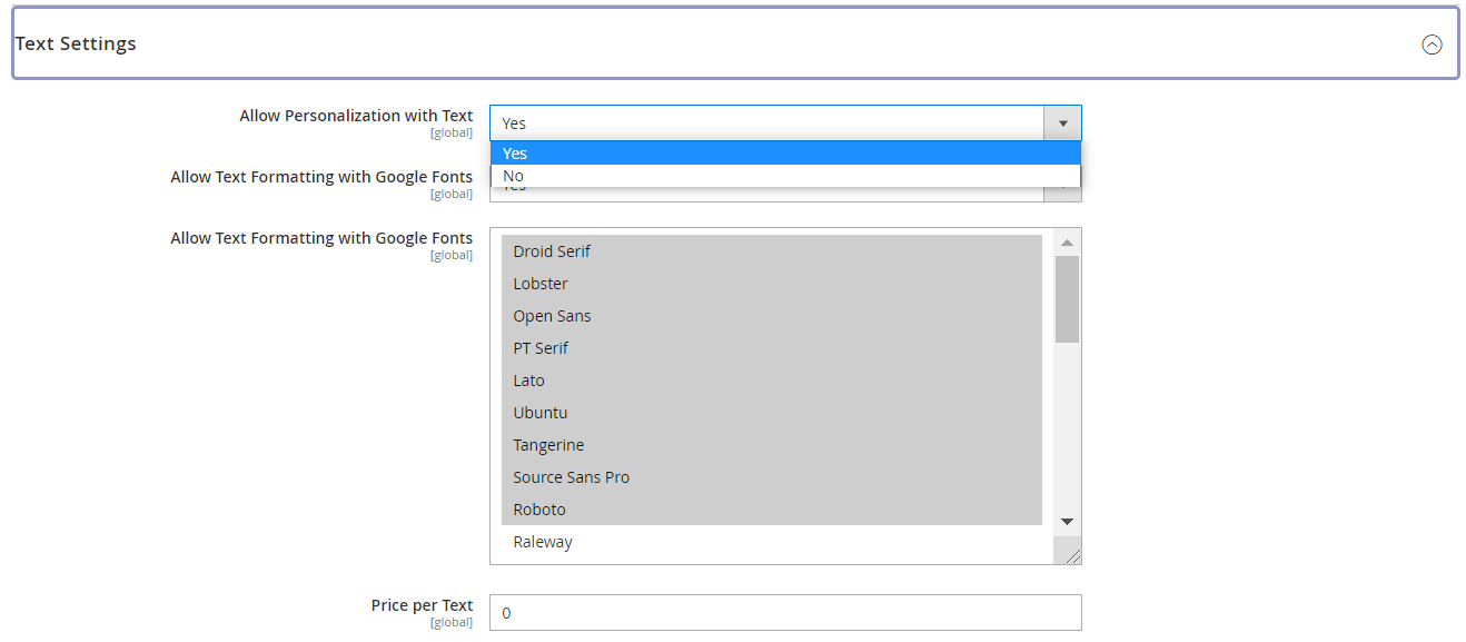 The admin can set an amount in this field. This amount will be charged for each text that will be added by the customer into the design area. Leaving this empty would make it free for the customers to add text.