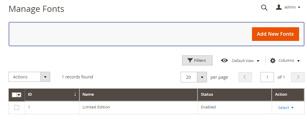 The store admin can navigate to Milople Extensions → Manage Fonts and find a grid where all created fonts are listed. The status and names of these existing fonts can be edited or new fonts can be added using the “Add New Fonts” button.