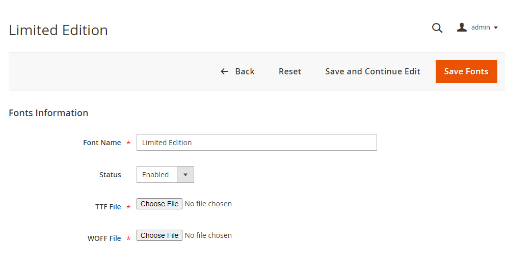 Clicking on “Select → Edit” for an existing font or clicking on “Add New Fonts” will redirect to the page shown below. “Select → Delete” will delete the selected font.