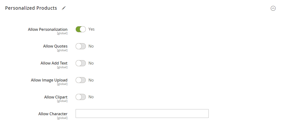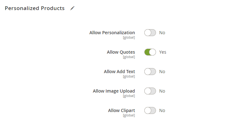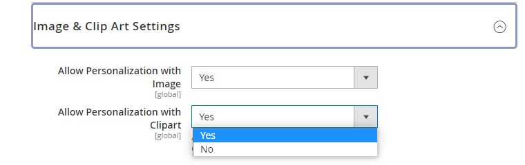 Setting these to “No” will not allow the customer to personalize the product with images and clipart.