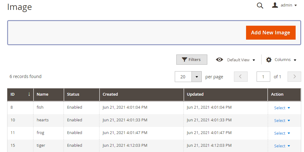By navigating to Milople Extensions → Manage Clipart image, the admin will be able to find grid shown below. Here all the created clipart images would be listed. New clipart images can also be added using “Add New image” button.