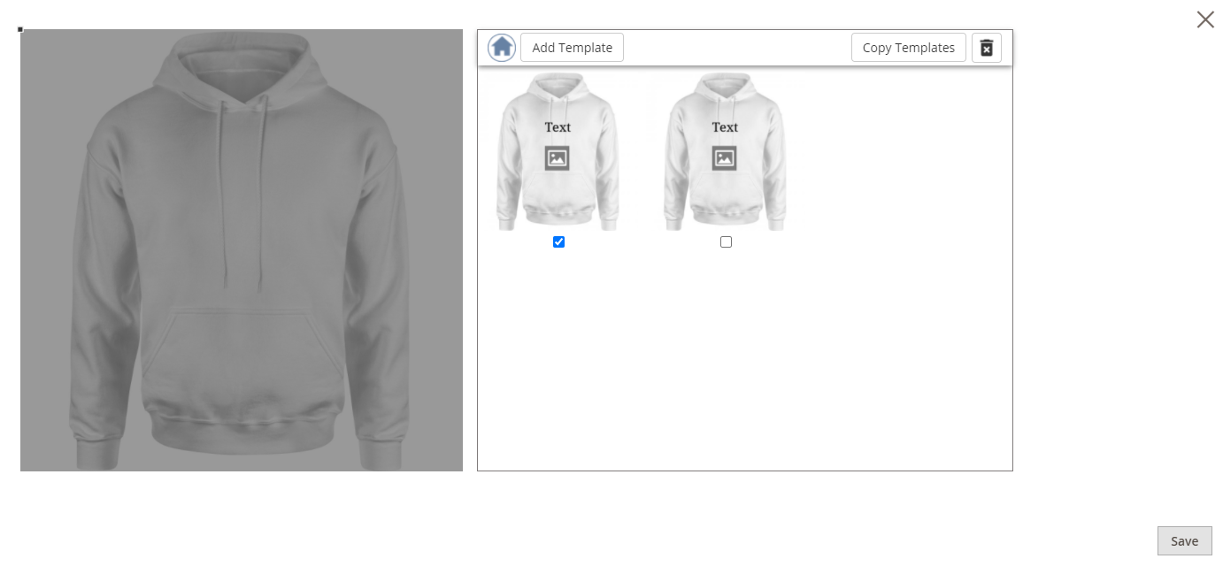 The admin can create templates on the back end through Catalog→Products. Click on “Edit” for the desired product, navigate to Images and Videos tab and click on “edit” icon. A model will be open as shown in the below image.