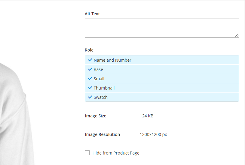 The admin can also assign Name and Number only to specific side of a product. The assignment of Name and Number for a particular side can be achieved by clicking on the desired product in catalogue section and then navigating to Images and Videos tab. The admin can find Name and Number along with options like Base, Small, Thumbnail etc.