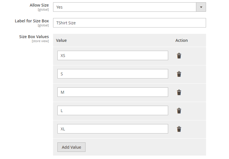 Size option will appear with the title given in the Label for Size Box field and values specified in the Size box Values field.