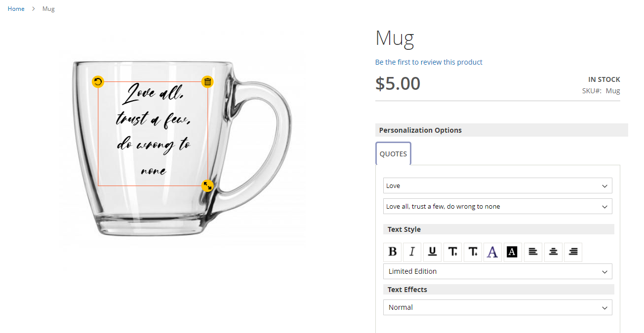 Using this feature the admin can customize the personalization button label to something like “Personalize Now”, “Personalize this product” etc.