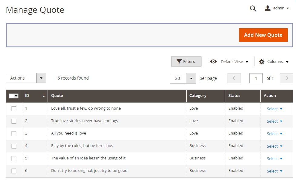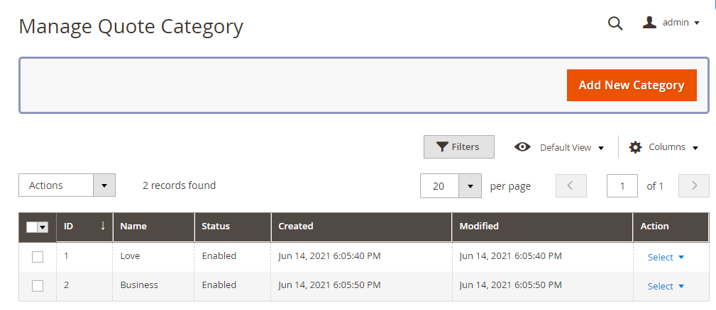 By navigating to Milople Extensions → Manage Quote Categories, the admin will be able to find grid shown below. Here all the created quote categories would be listed. New categories can also be added using “Add New Category” button.