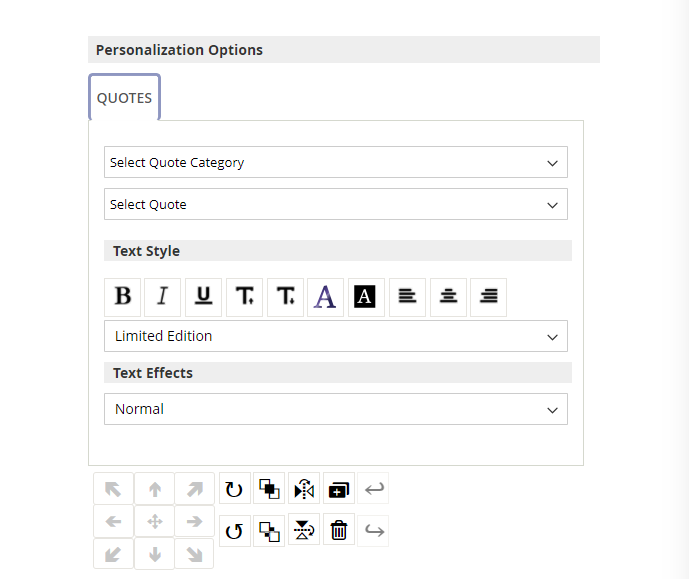 The “Quote” functionality allows the customer to add predefined quotes in the design area.