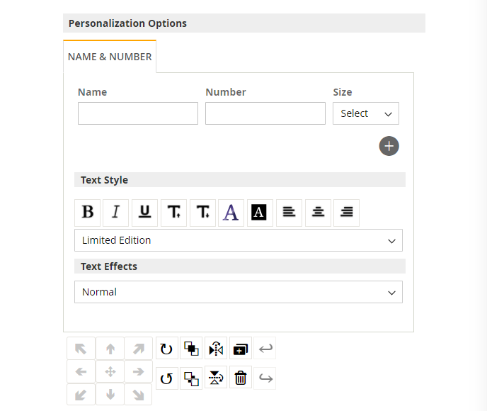 The “Name and number” functionality allows the customer to add name and/or number in the design area.