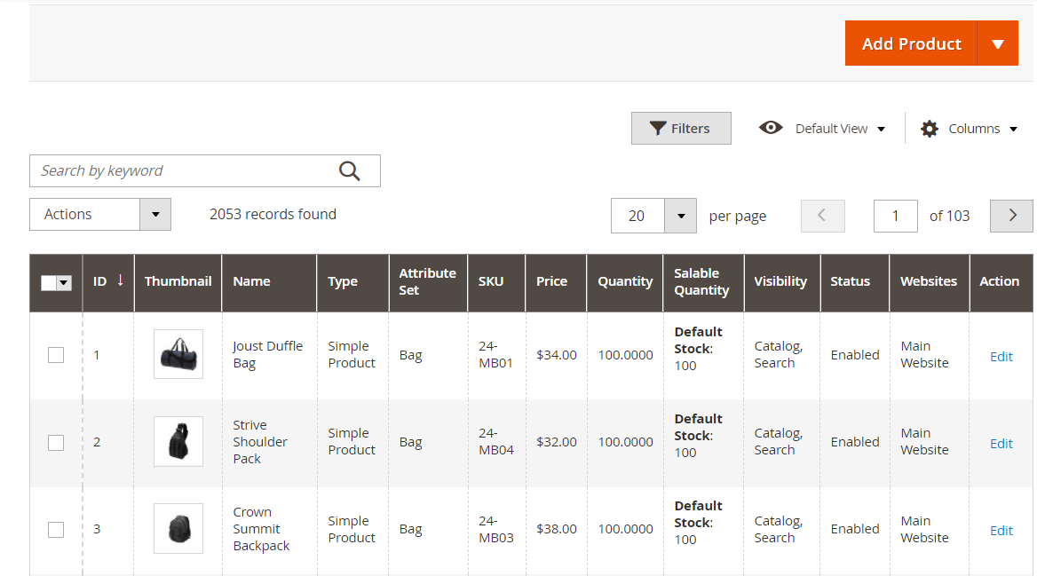 Navigate to Milople Extension → Catalog will open the following grid with all store products listed.