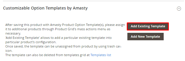 Let's see how to assign a template to a particular product on the product settings page. Open any product settings page and scroll to Customizable Option Templates by Amasty tab.