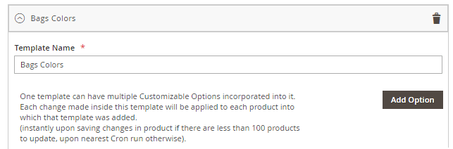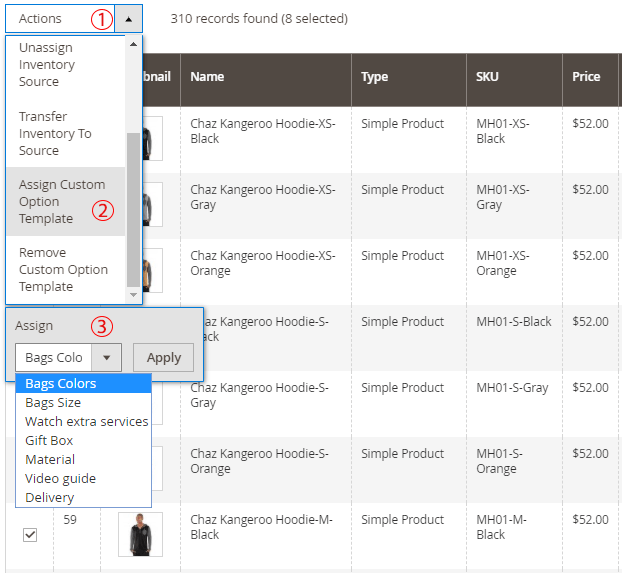 Once a template is created, you may easily assign it to a particular product or to multiple items. Therefore, there are 2 ways to assign options for goods: in each product settings or via mass action in a product grid. Any template changes will be automatically applied to all assigned products.