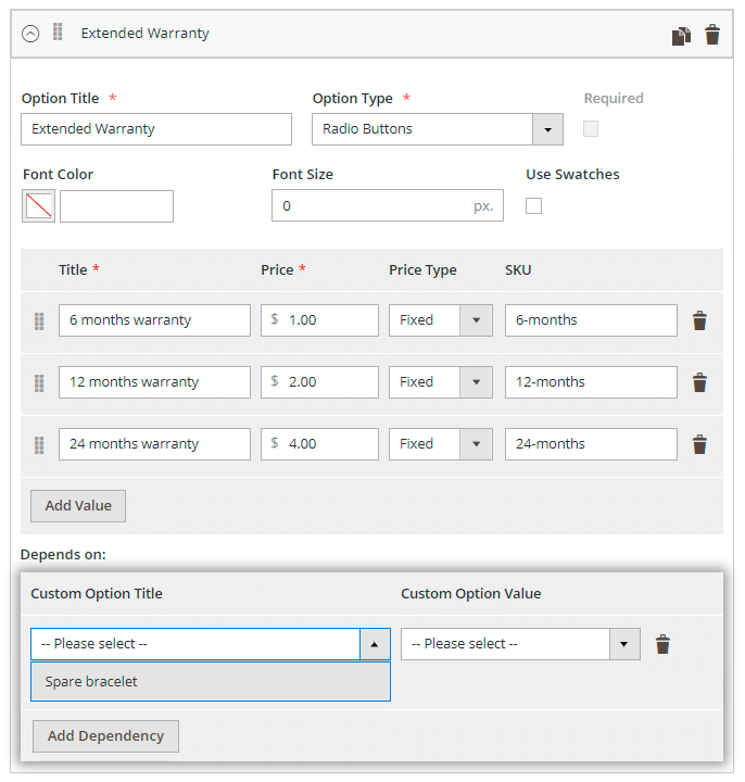 Hit the 'Add dependency' button below the child option (e.g. the ‘Extended Warranty’) and then select from the dropdown a parent option thus making it dependent (e.g. the ‘Spare bracelet').
