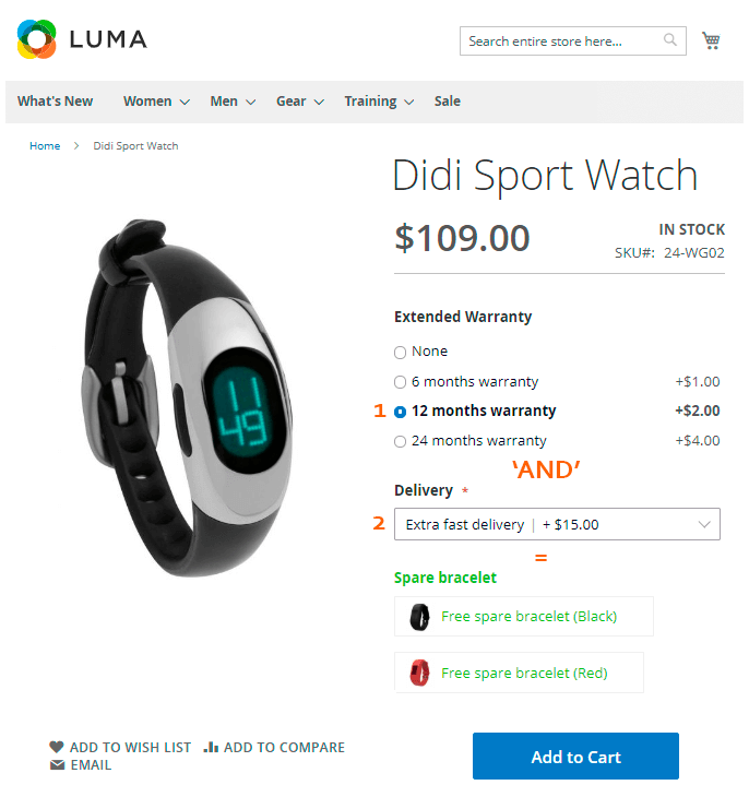 For example, it helps if you want a customer to be able to choose a spare watch bracelet for free only in case this customer has chosen the '12' or '24 months warranty' and the 'Extra fast delivery'.