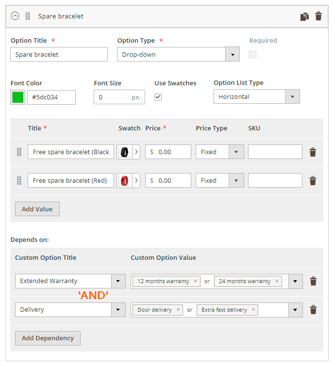 With Product Option Templates for Magento 2 you can create dependencies working based on two types of logic for the available product options: 'AND' and 'OR'.