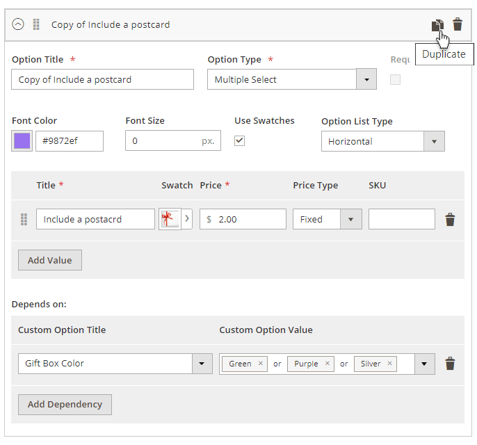 Duplicate custom product options by clicking on a little 'copy' sign on the right upper corner of the template's frame. After clicking, the option would be immediately copied and displayed on the bottom, below other product options. You'll recognize it by a title starting with “Copy of [your product option's name]”.