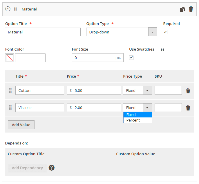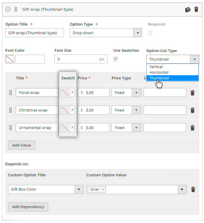 With this feature, you can stylize custom options and their values by specifying font size, font color and also by downloading custom images. You can find more info below on how to configure swatches from the custom options and stylize them.