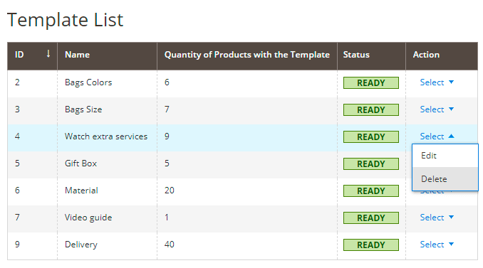 See all the existing product options templates in a grid: Catalog → Template List. View each template status and the number of products for which it is applied. Delete any of the templates if needed, and it will be automatically removed from all the products. Edit templates right from the grid.