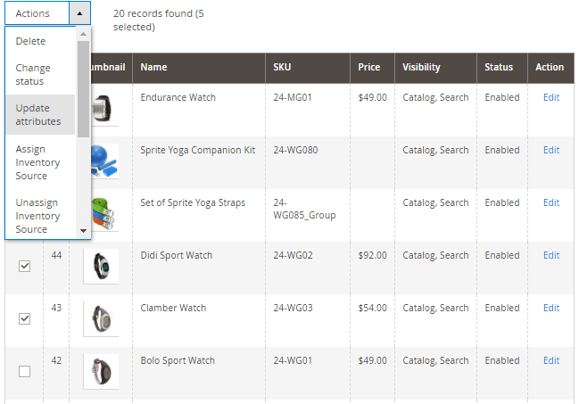 Also, you can assign or remove templates to one or multiple products via Update Attributes option. Choose all the products you need in the product grid. Then, in the Actions tab, click Update attributes.