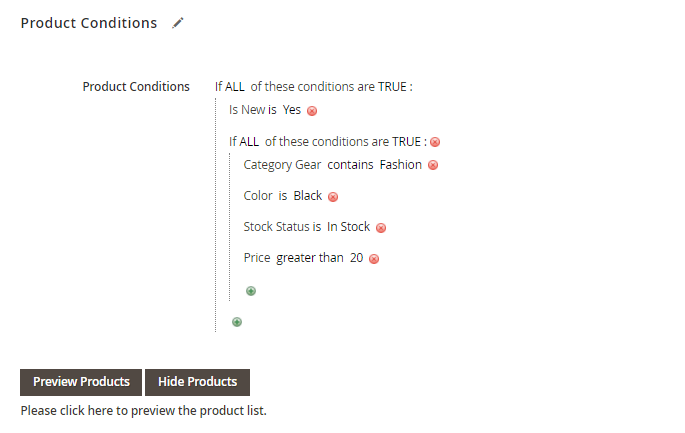 Use flexible conditions to specify which products the label should or shouldn’t be displayed. In conditions, you can apply any of the following attributes: