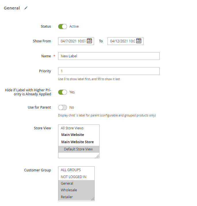 Customer Groups - Indicate the Customer groups to which the label should be displayed.