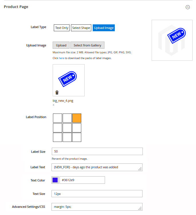 Label Position field has a nine-position grid, where you can select the needed location for the label. There is also a real-size preview window right in the settings, so you don't have to check it on the front-end time and again.